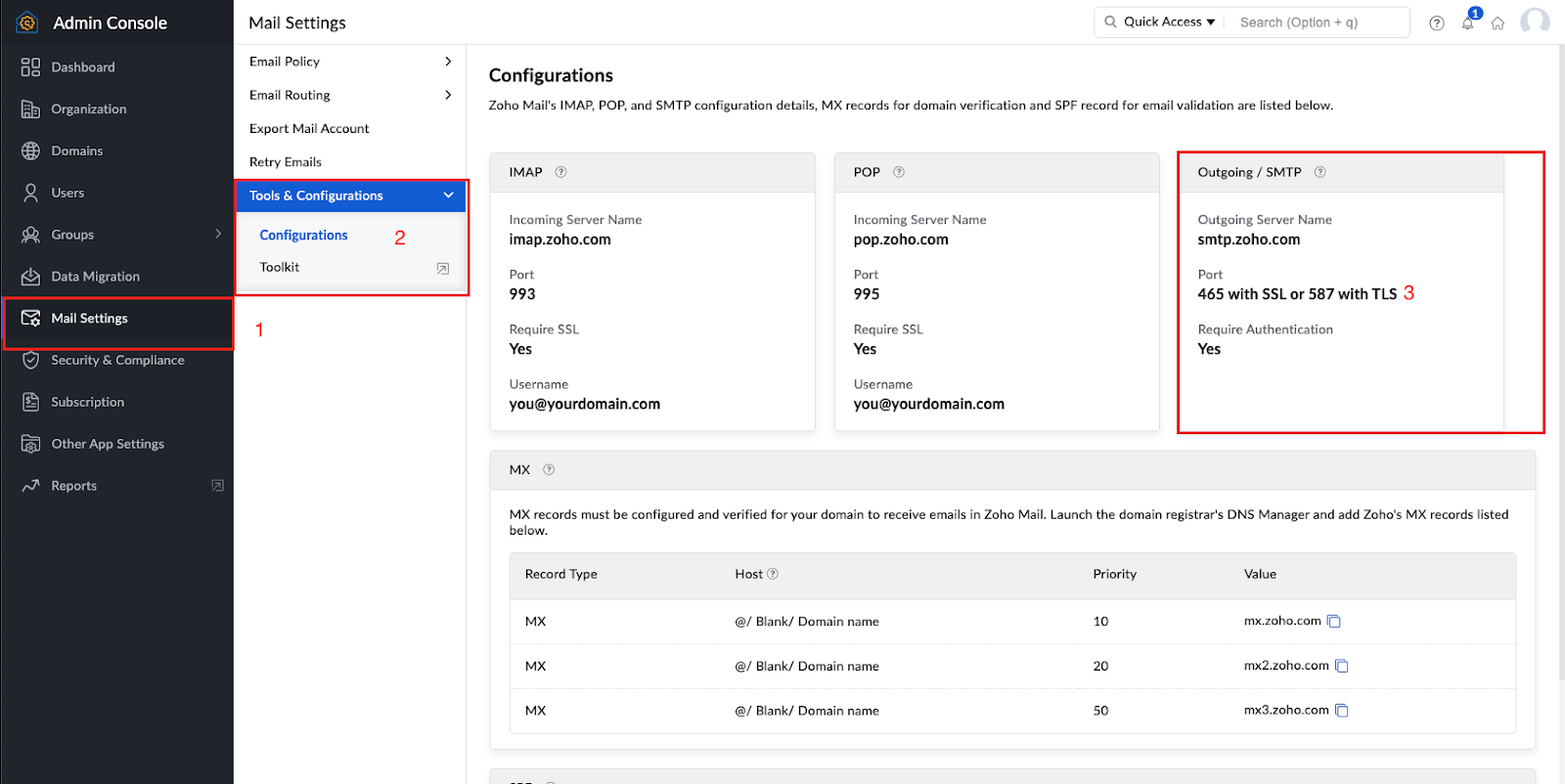 In Admin Console, go to Mail Settings -> Tools & Configurations -> Configurations -> Outgoing / SMTP.
