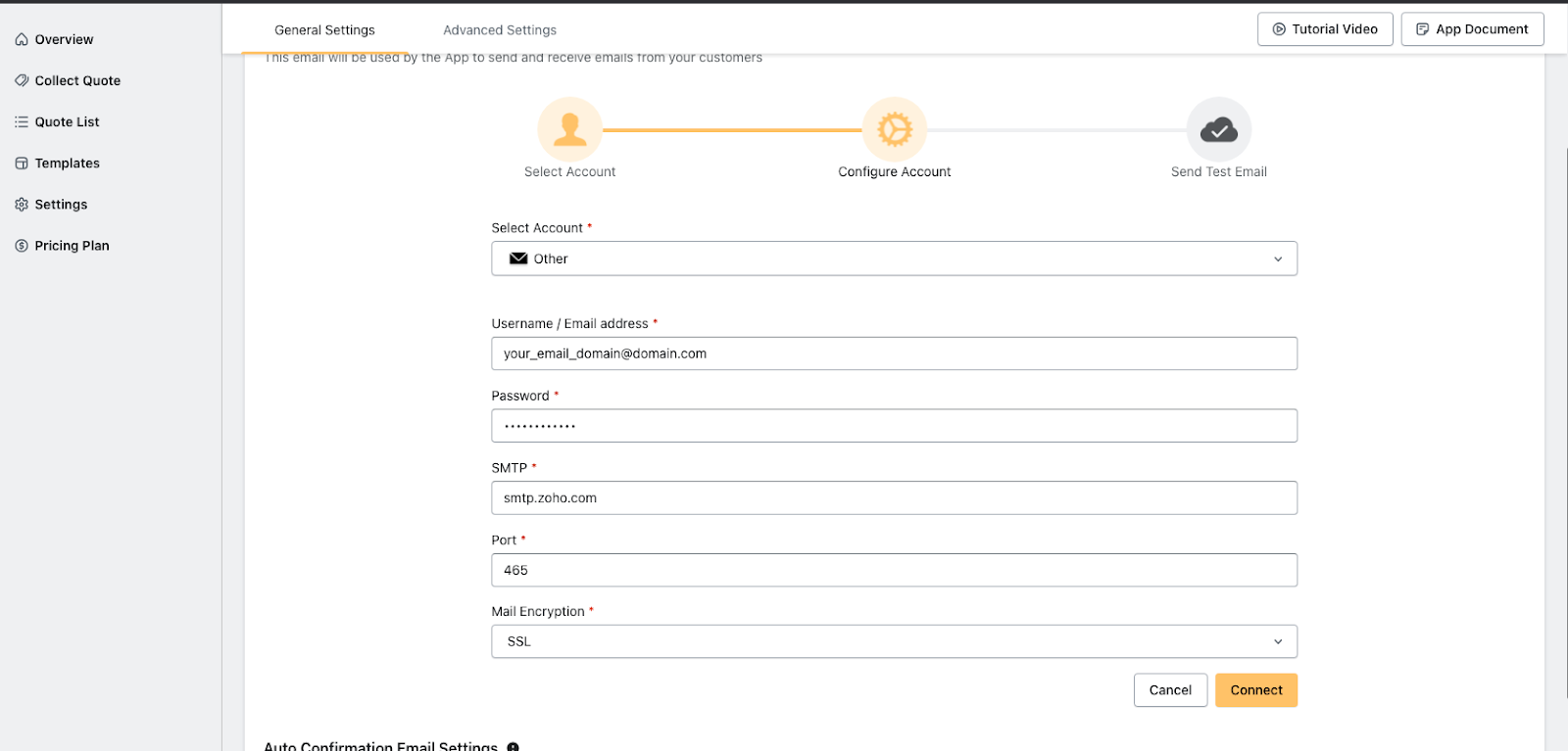 Important: Ensure your email is correctly configured before connecting it to our system. You can also use this website to verify the settings prior to use. With other types of email, SMTP way is available. You can check your email guide to get your email app password.
