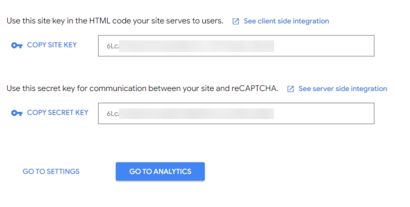 Step 5: Copy "Site Key", "Secret Key" and paste them to the Behavior settings