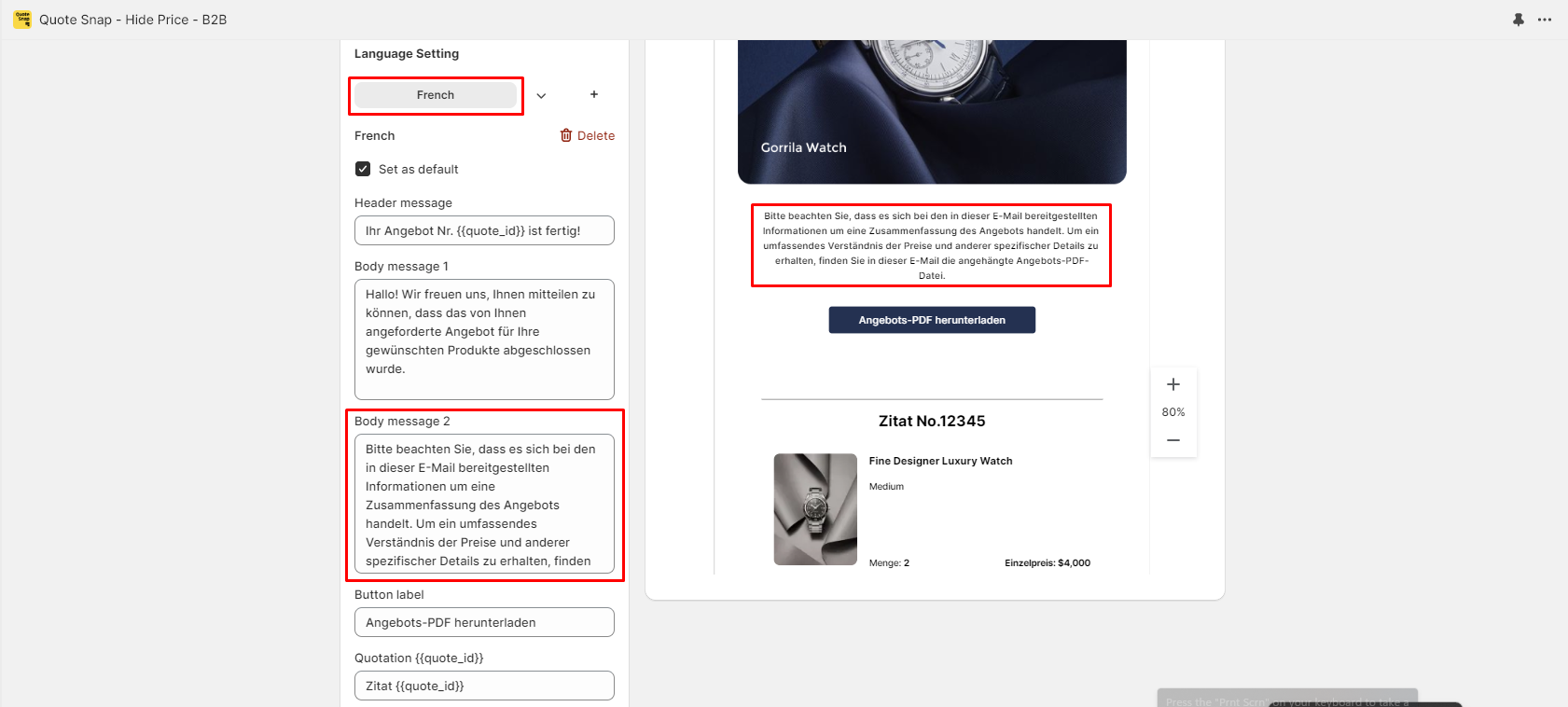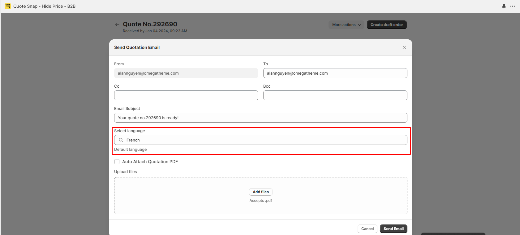 <figure><img src="https://content.gitbook.com/content/uetVwmH2Z9tlAzaYpPSn/blobs/sCM4uvnzU2F3g29YmEn1/image.png" alt=""><figcaption><p>French will automatically be selected whenever you want to send quotation email to customers</p></figcaption></figure>