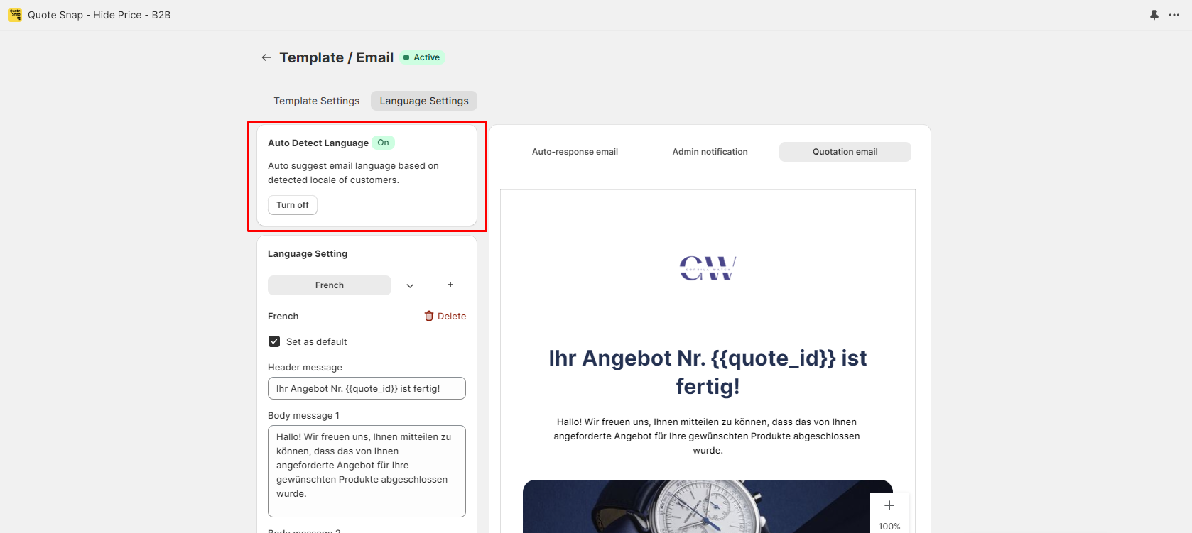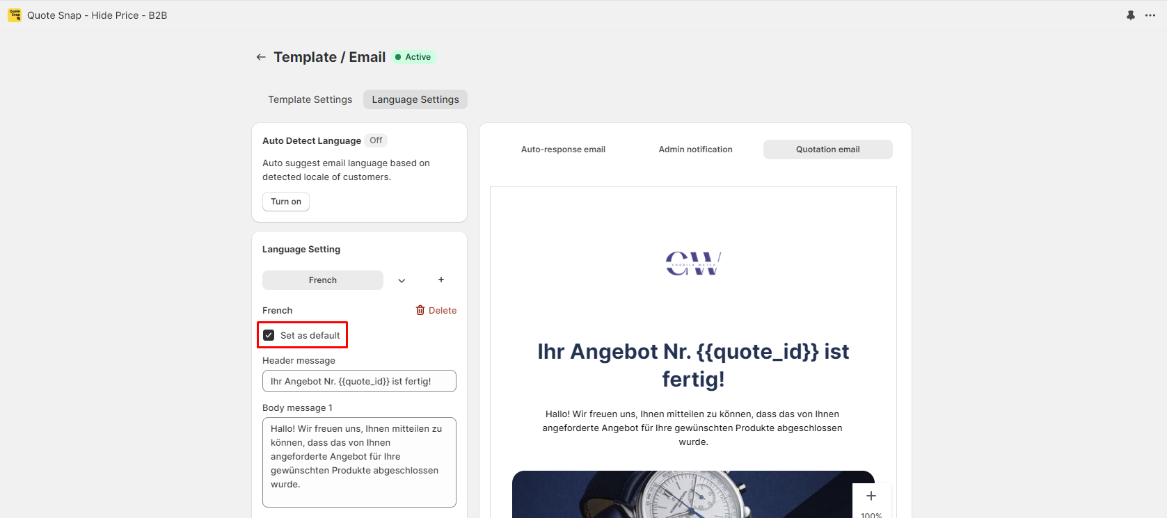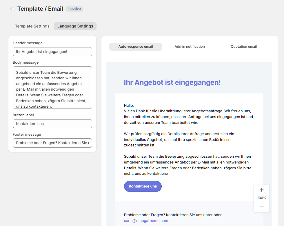 For example, if a German customer submits a quote request, and you already have a German version of the auto-response email, the email will be sent in German.