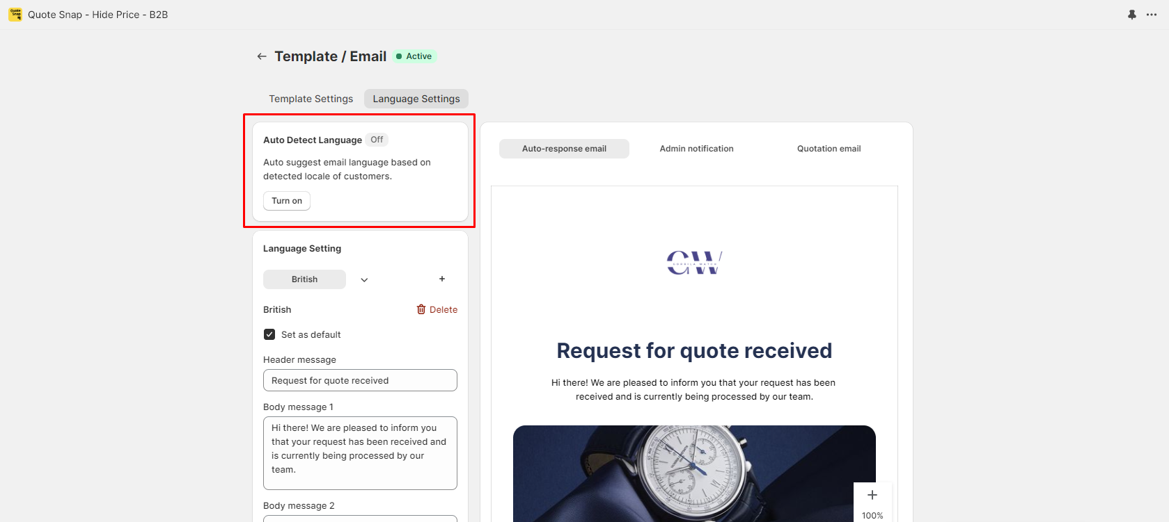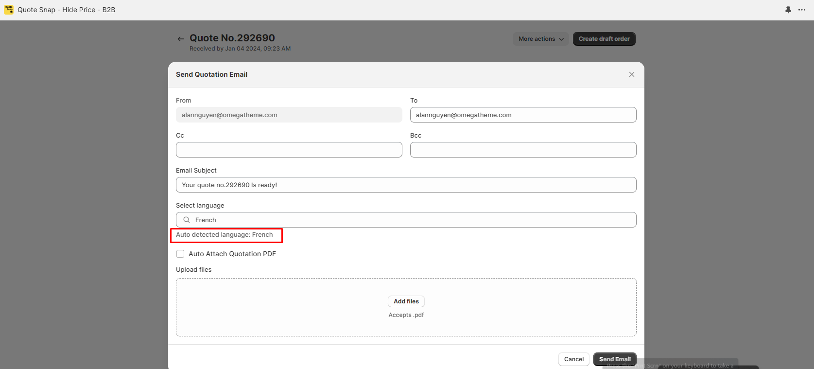 When activated, this feature automatically identifies and recommends the language used by customers submitting the quote requests, during the process of sending out a quotation email to customers. The language identification technique is based on the customers' locales.