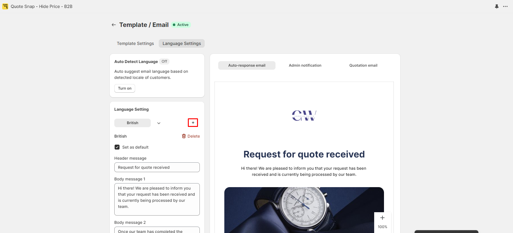 **Add a language version:** You can add 1 or more language versions by clicking on the :heavy\_plus\_sign: icon on the right of the language tabs. As a result of adding more language versions to this feature, the Quote Detail feature will present these options while you are trying to send either an auto-responder email or a quotation email to your customers.