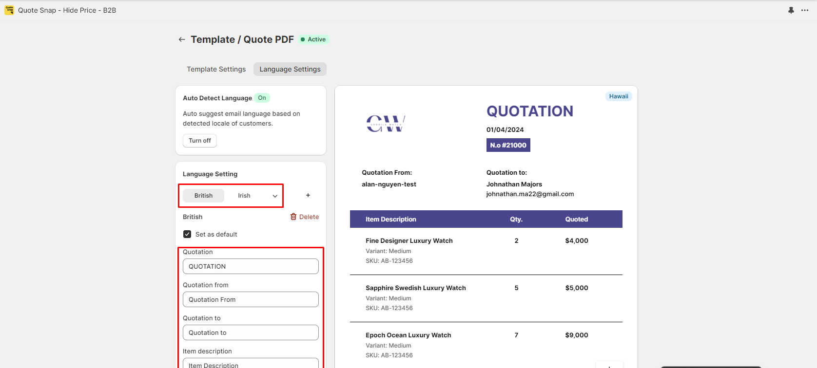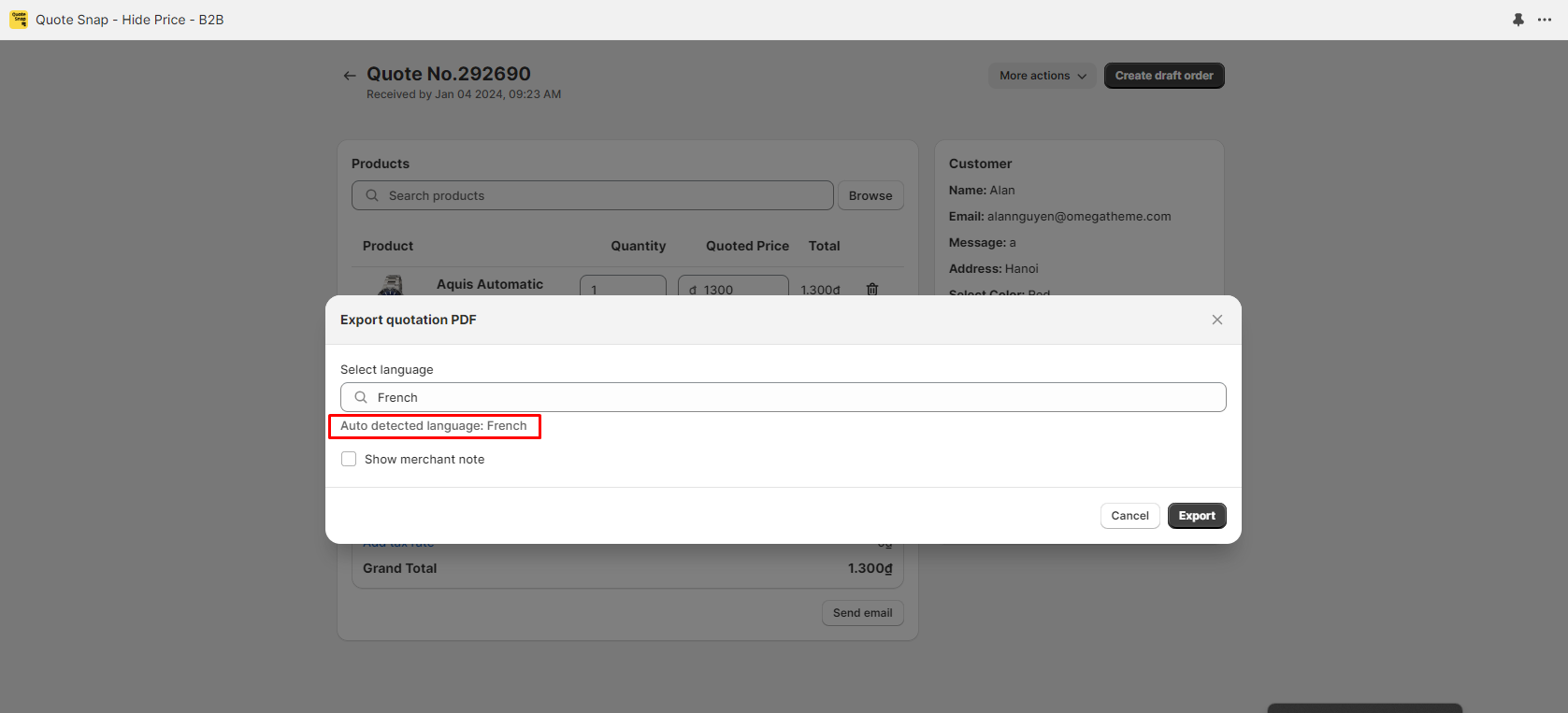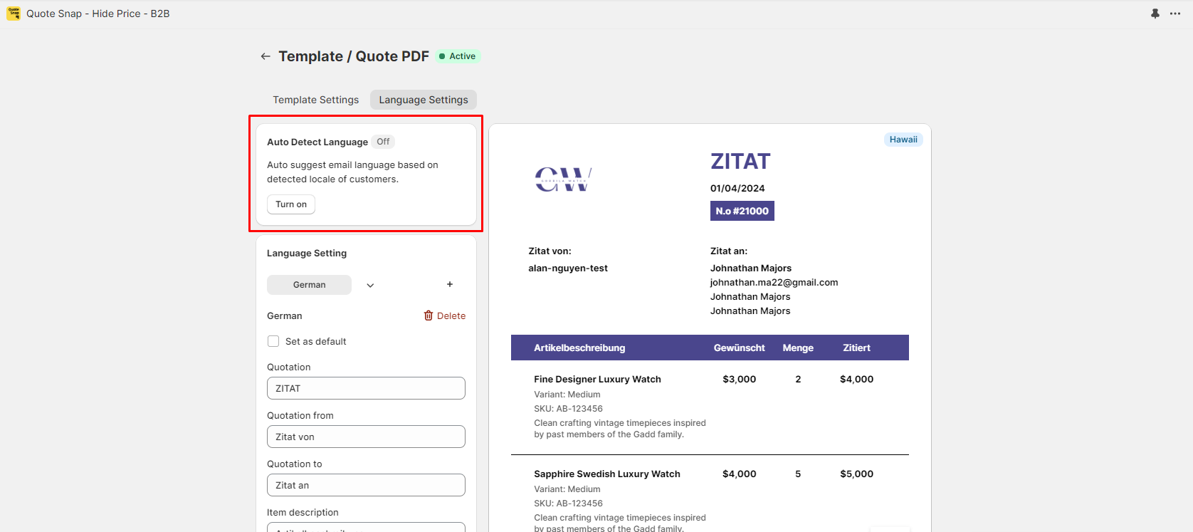 When activated, this feature automatically identifies and recommends the language used by customers submitting the quote requests, during the process of exporting a quote to PDF. The language identification technique is based on the customers' locales.