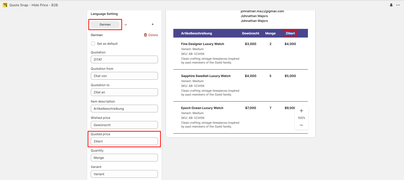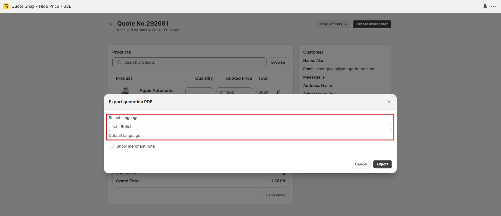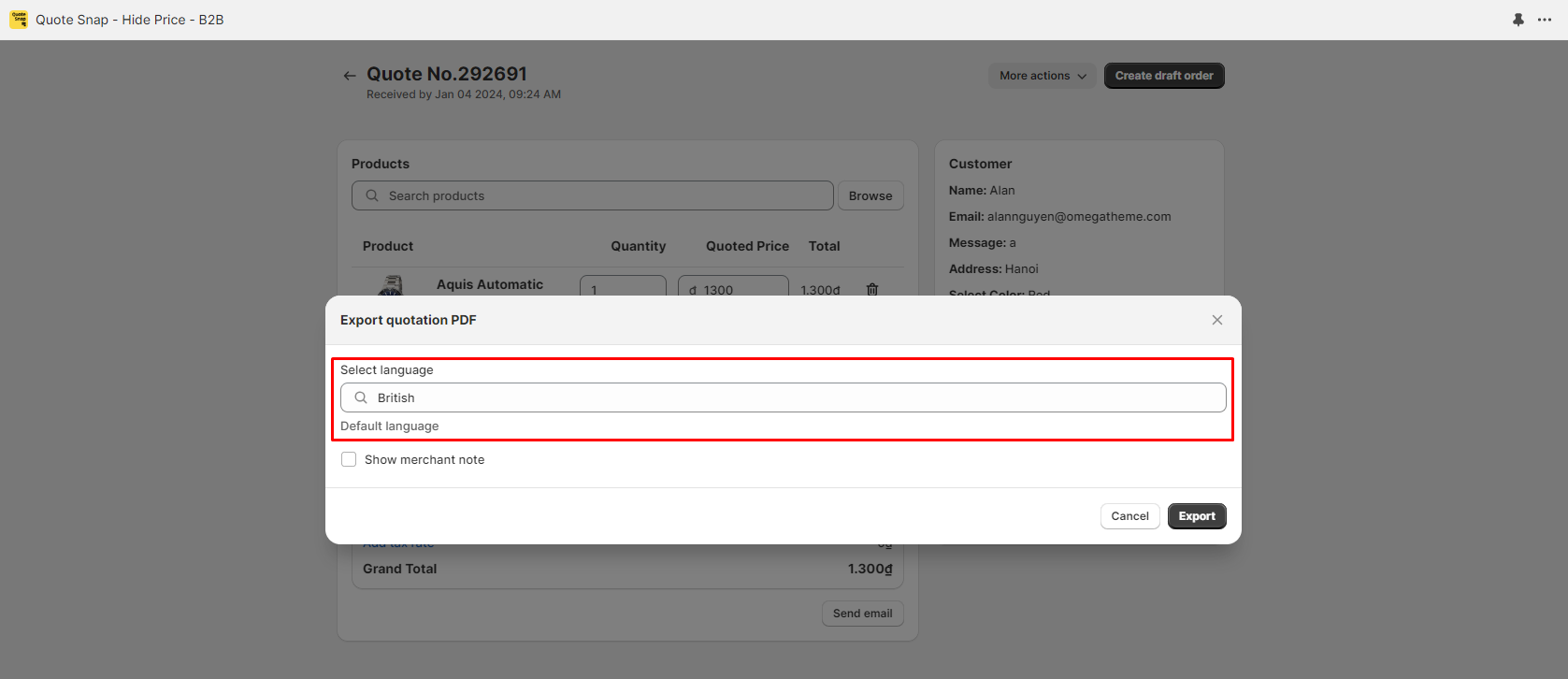 When activated, this feature automatically identifies and recommends the language used by customers submitting the quote requests, during the process of exporting a quote to PDF. The language identification technique is based on the customers' locales.