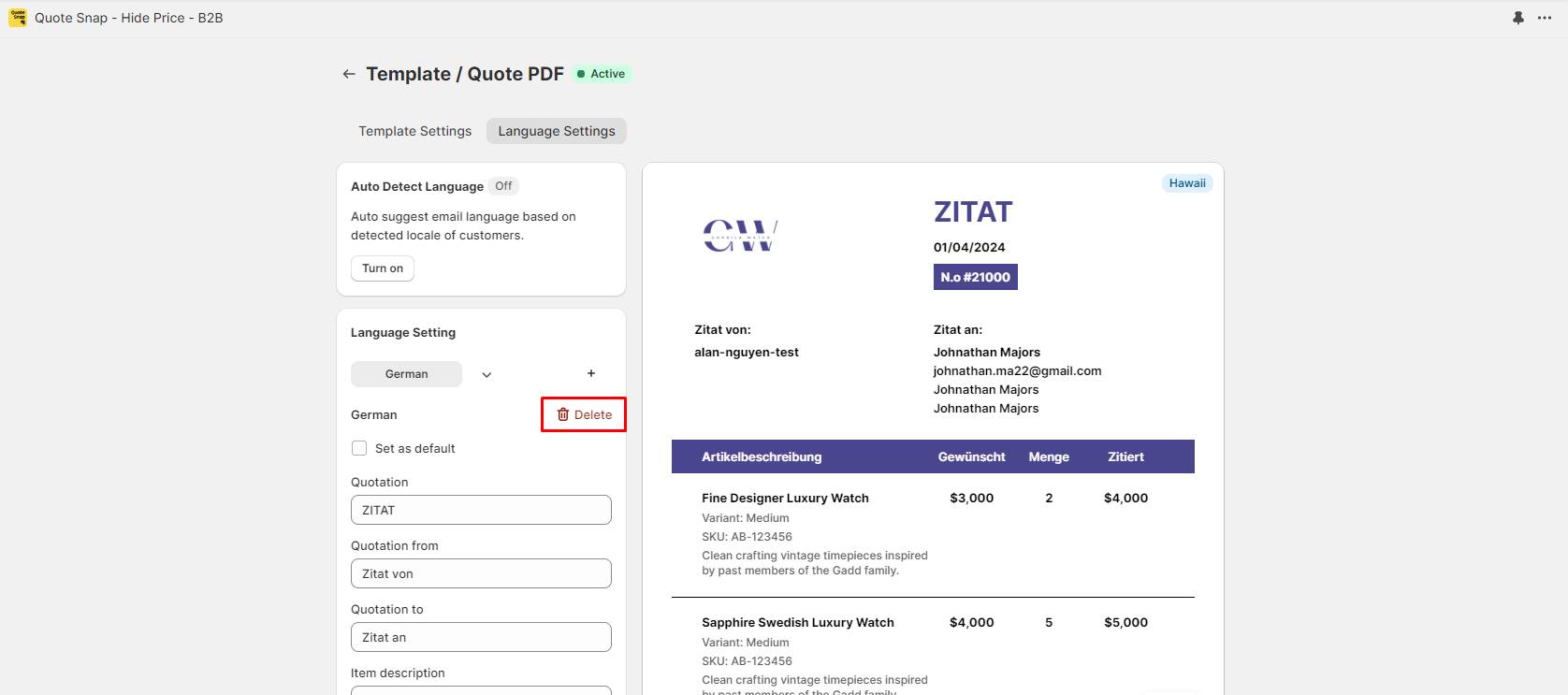 **Set a language version as default:** When a language version is marked as ‘Set as default’, it will be automatically chosen as the default language for the quote PDF when you try to export one.