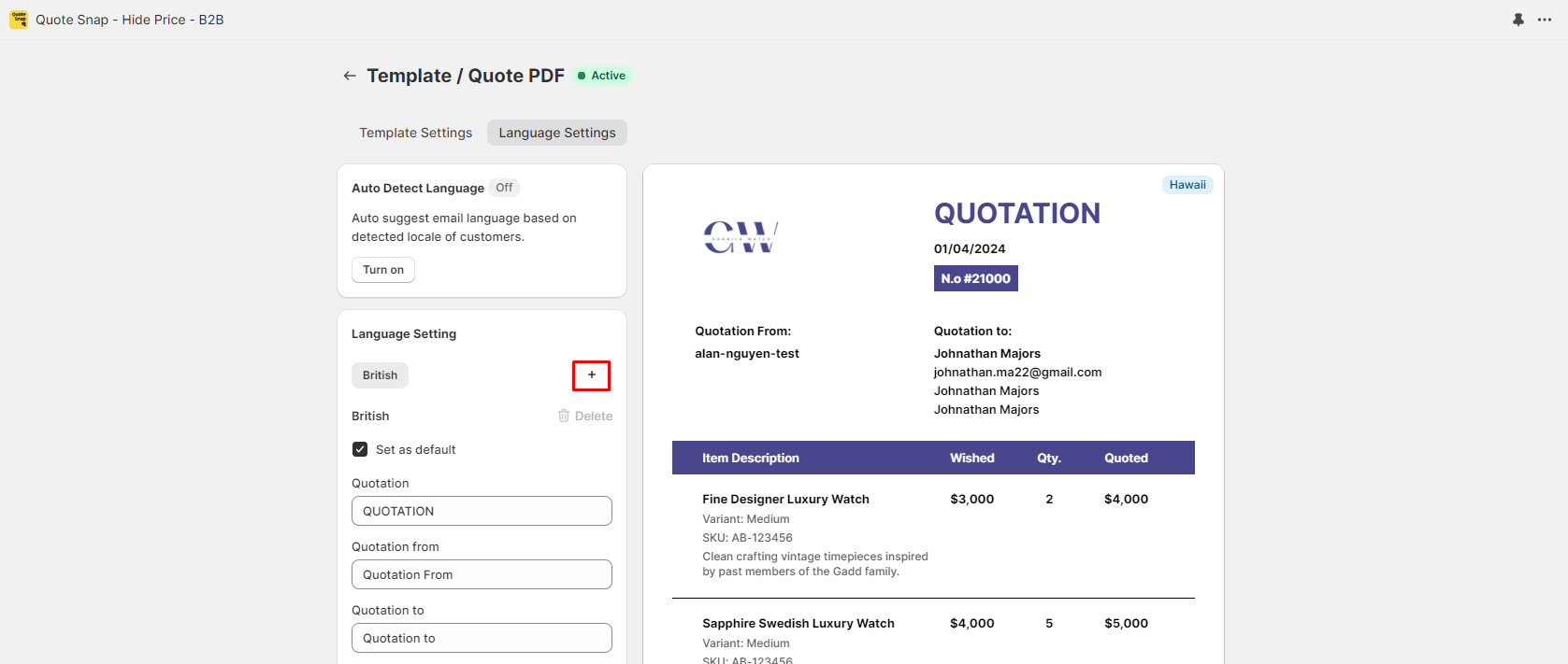 **Add a language version:** You can add 1 or more language versions by clicking on the :heavy\_plus\_sign: icon on the right of the language tabs. As a result of adding more language versions with this feature, the Quote Detail feature will present these options while you are trying to export a quote to PDF.