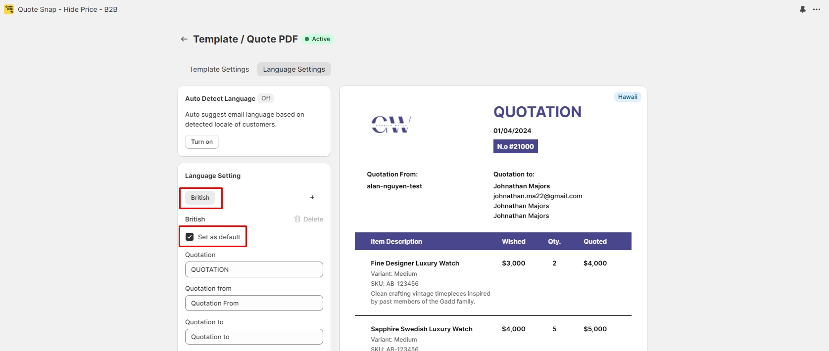 Set a language version as default: When a language version is marked as ‘Set as default’, it will be automatically chosen as the default language for the quote PDF when you try to export one.