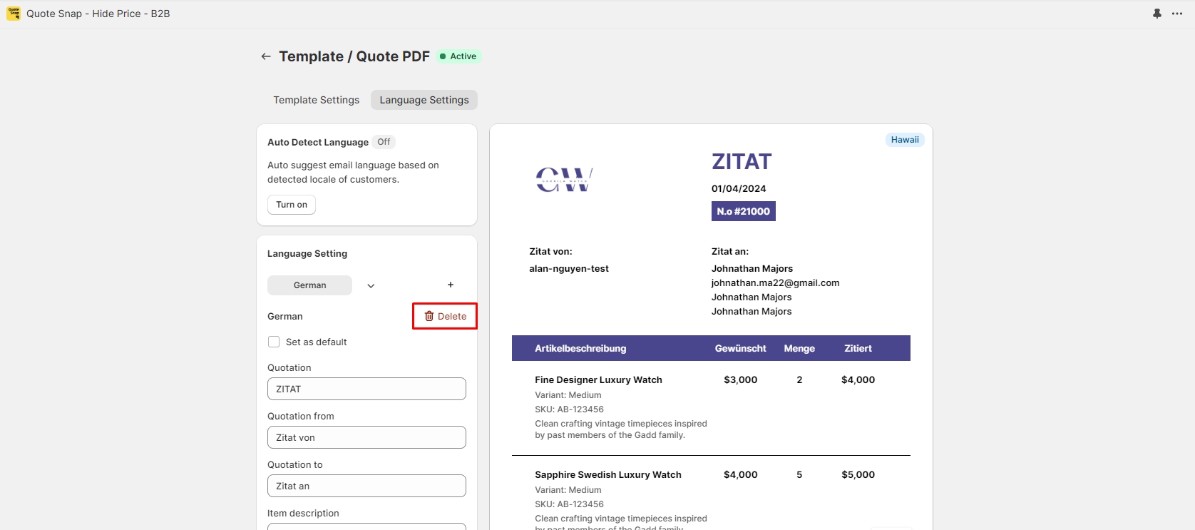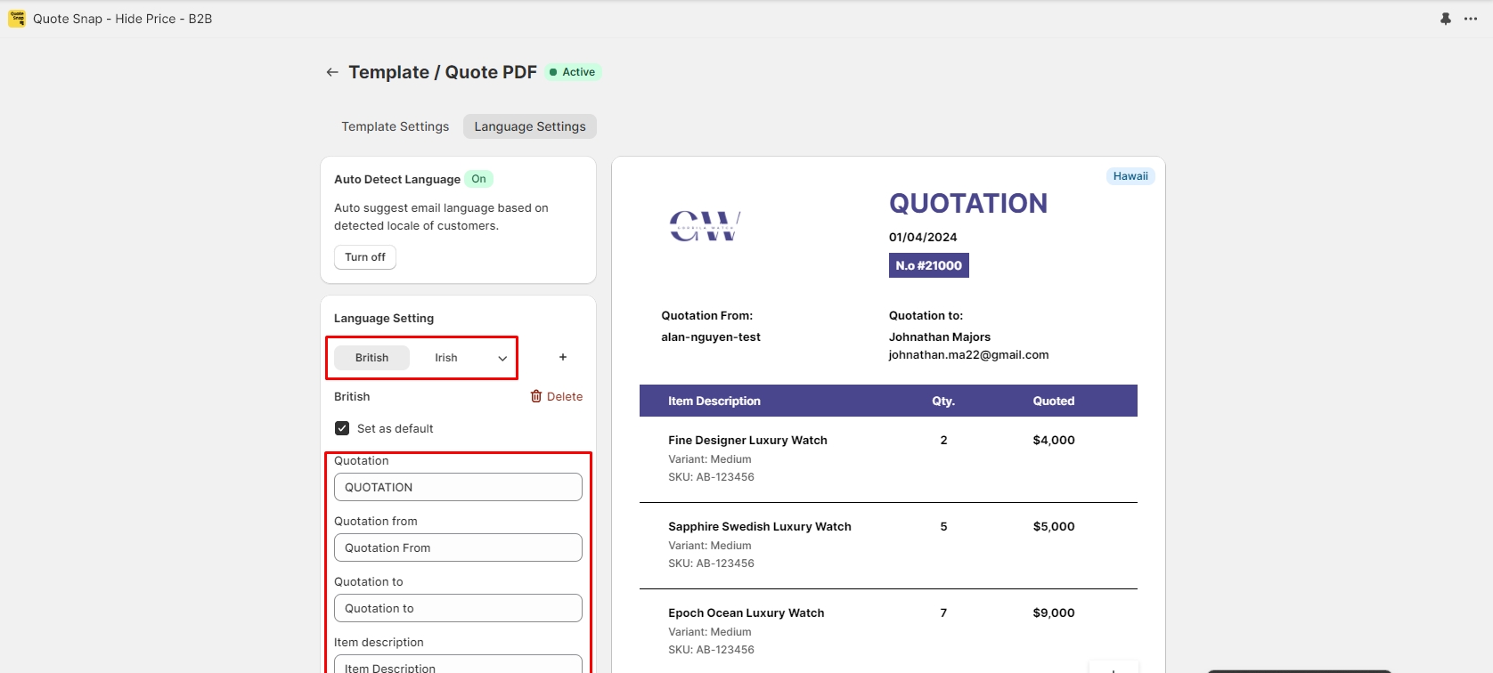 Add a language version: You can add 1 or more language versions by clicking on the ➕ icon on the right of the language tabs. As a result of adding more language versions with this feature, the Quote Detail feature will present these options while you are trying to export a quote to PDF.