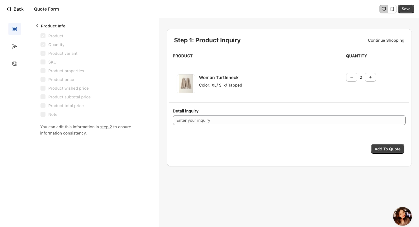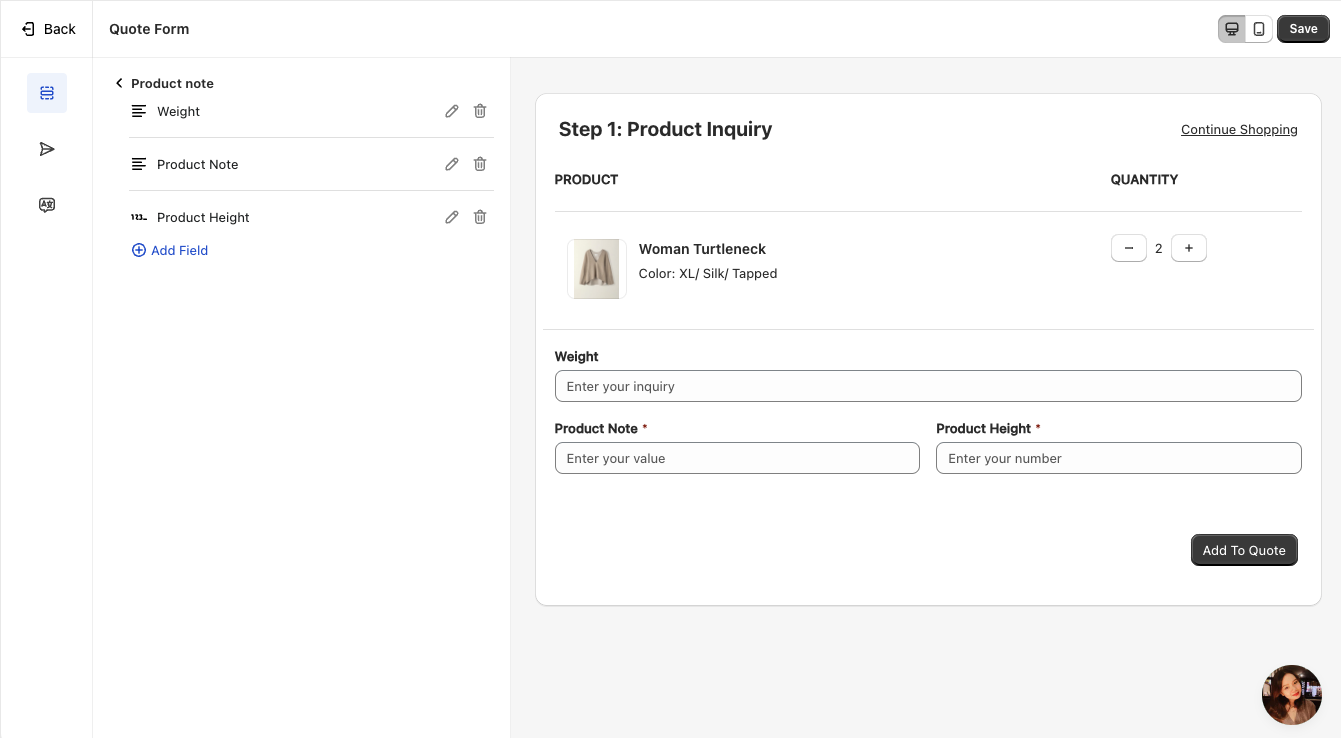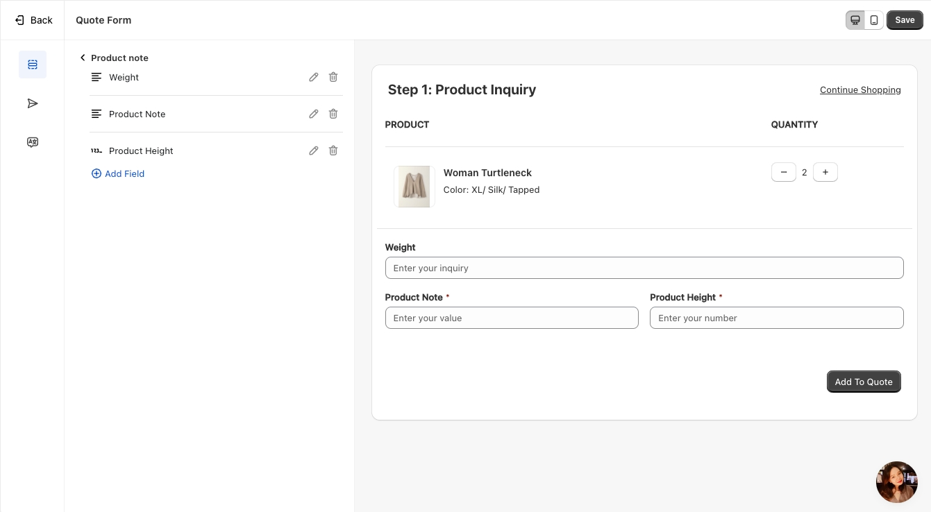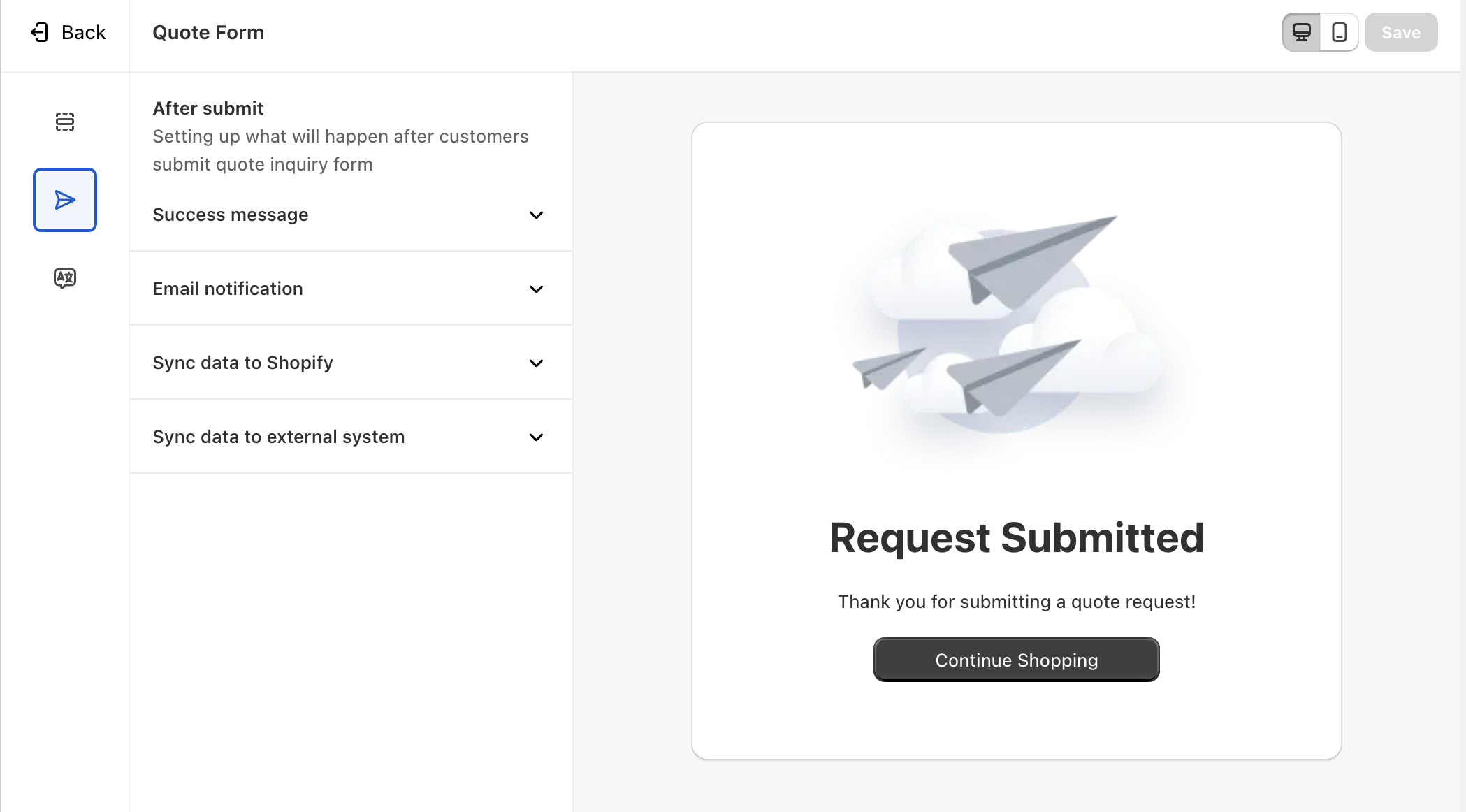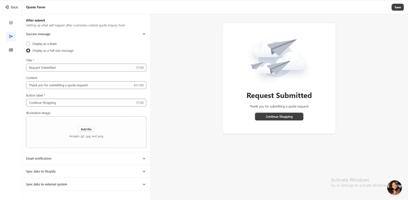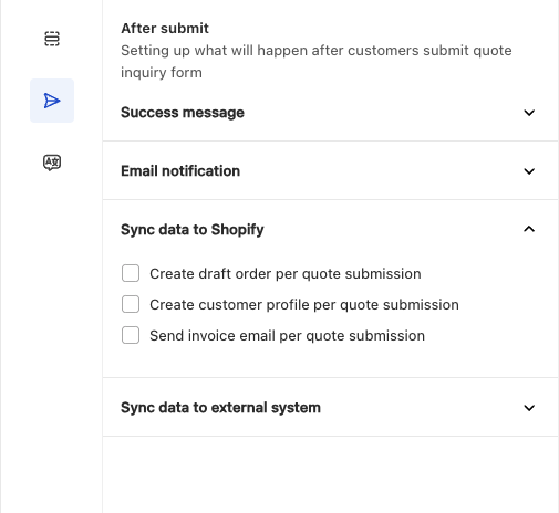 Sync Data to Shopify – Transfer the submitted quote data to Shopify for seamless integration.