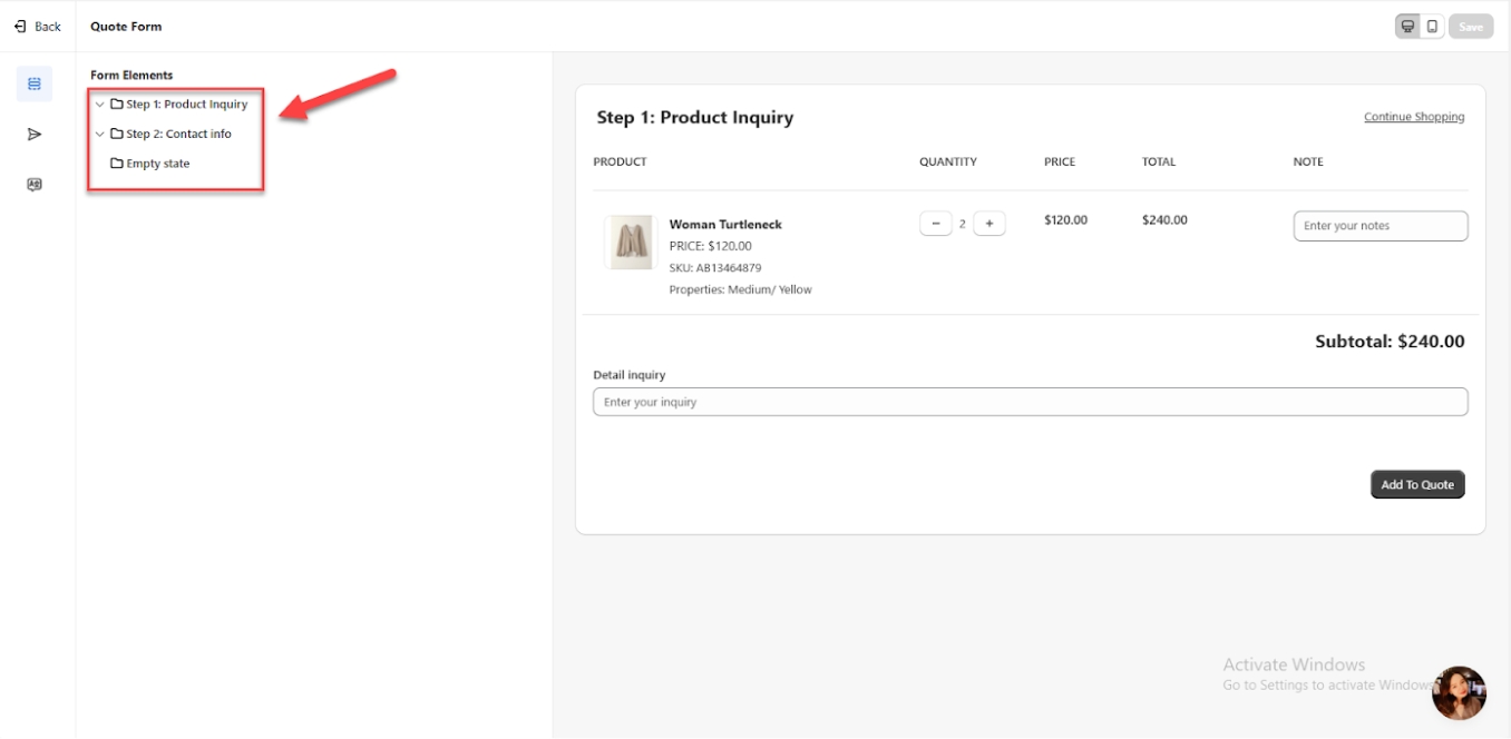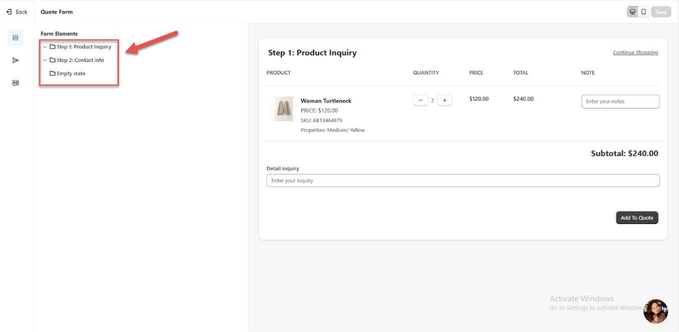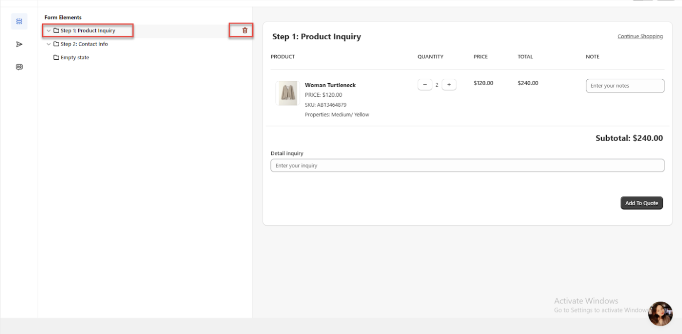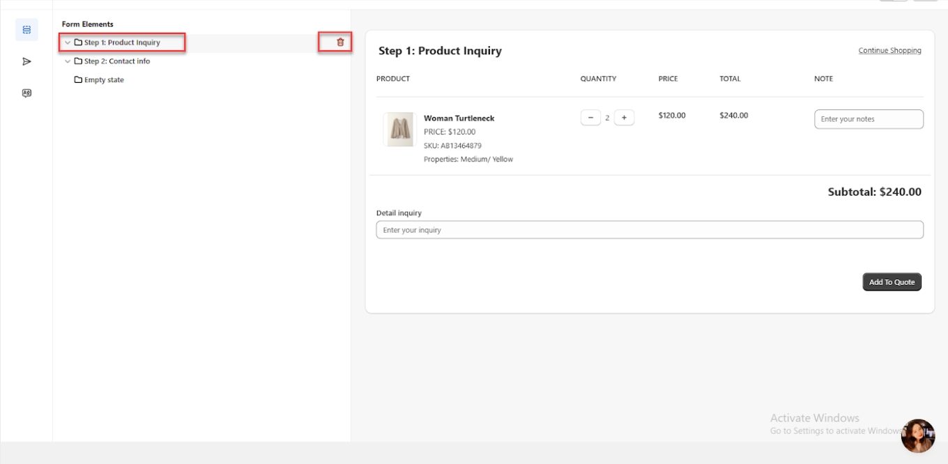 You can delete "Step 1 - Product Inquiry" by hovering over it if you prefer not to use a multi-step form or want to skip filling in the product information. This option allows you to simplify the form setup and eliminate the product inquiry step entirely, making the process quicker and more streamlined.