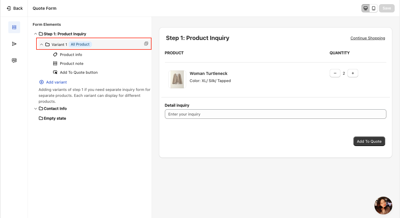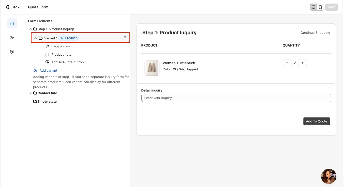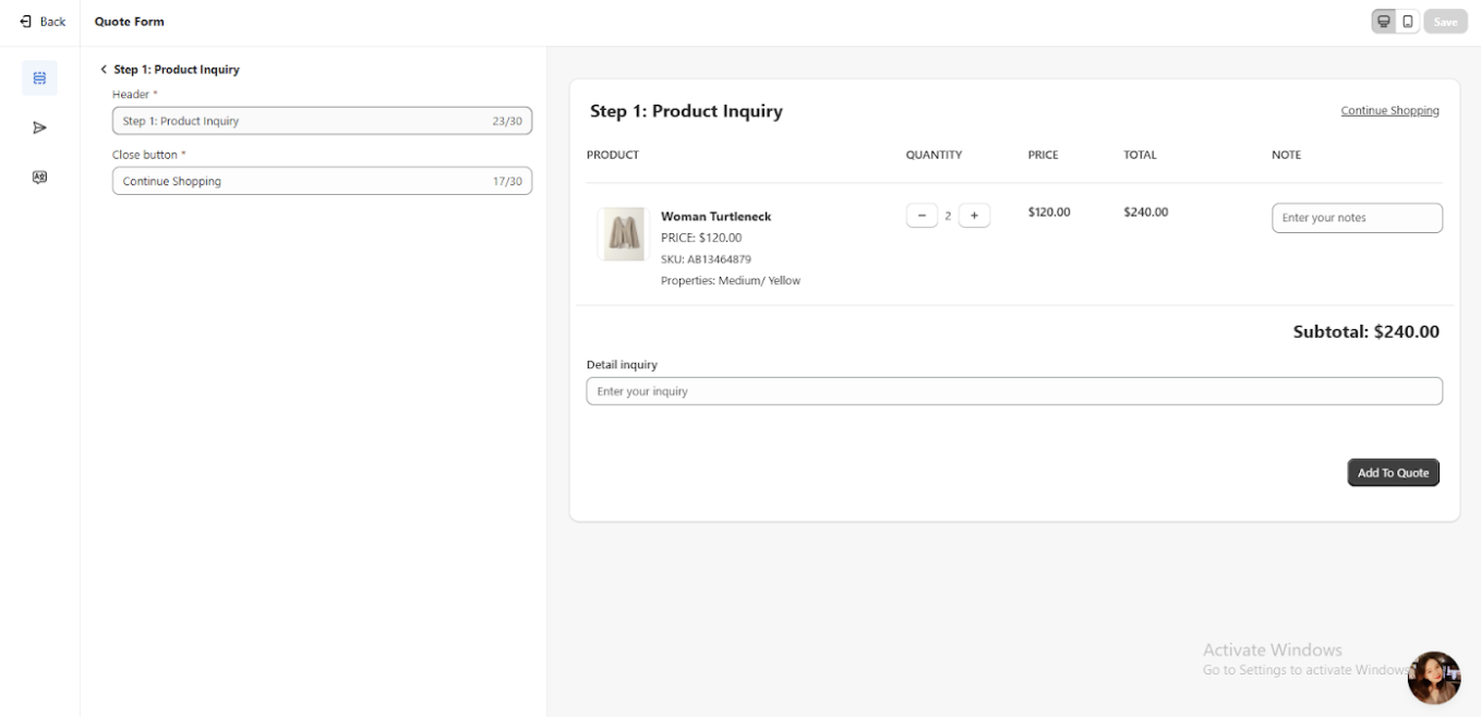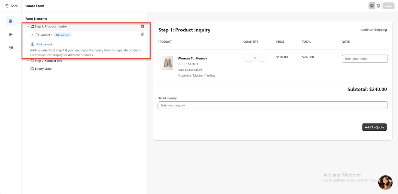 You can delete "Step 1 - Product Inquiry" by hovering over it if you prefer not to use a multi-step form or want to skip filling in the product information. This option allows you to simplify the form setup and eliminate the product inquiry step entirely, making the process quicker and more streamlined.
