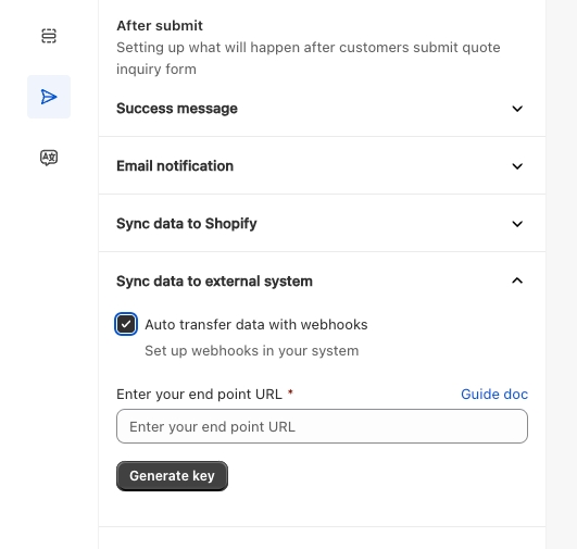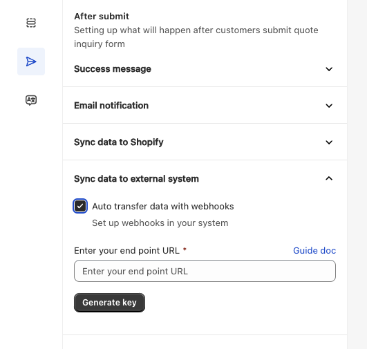 Sync Data to External System: This option enables the setup of data synchronization with other systems via webhook. When activated, quote data will be sent directly to the specified webhook endpoint, allowing integration with external platforms. For further details on setting up and configuring the webhook, please refer to this documentation for more information.