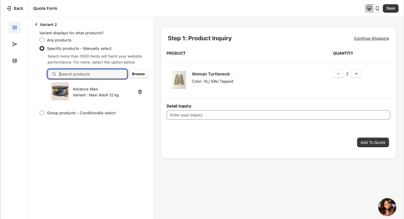To expand the detailed settings for Step 1, you can add additional variants. A variant is always required for all product conditions, but you have the option to add more variants. Each variant can be configured to group specific products together. We use the latest form for storefront display based on each condition. Additionally, you can duplicate or delete variants as needed to further customize your product form setup.