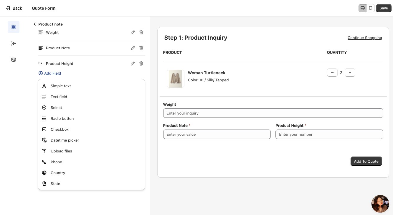 Step 1 - Product Inquiry: This form is designed to collect product information. You can customize it with dynamic fields to include details like weight, description, and additional notes.
