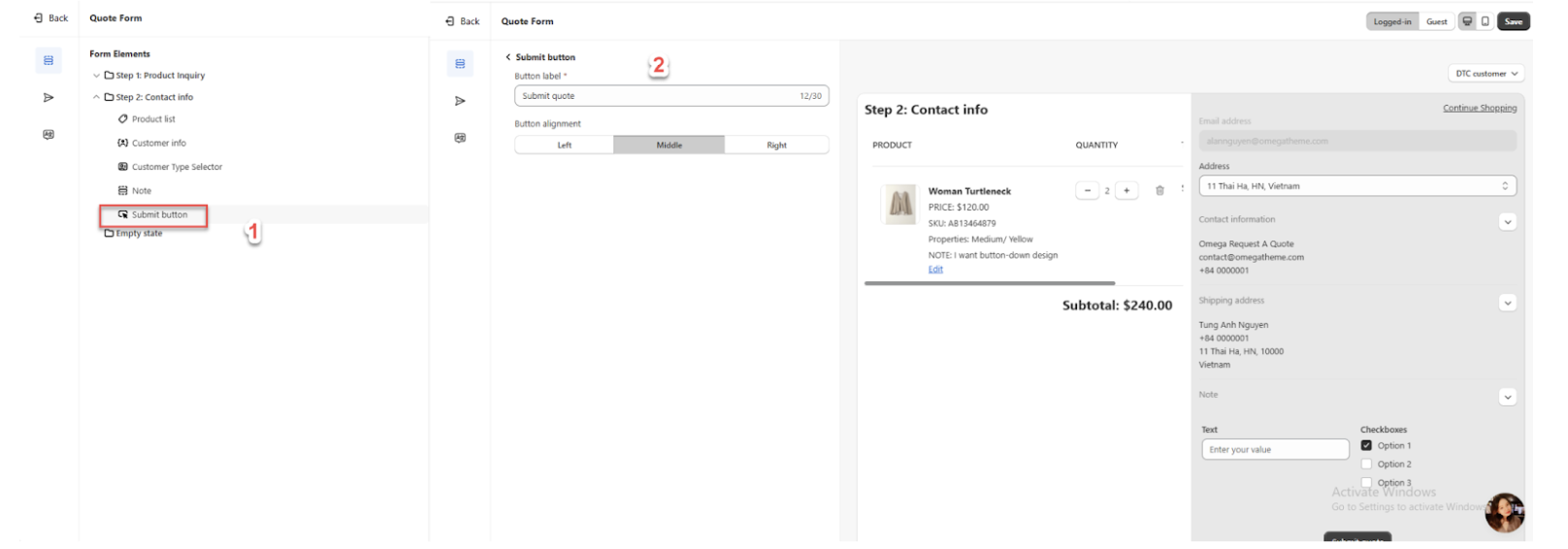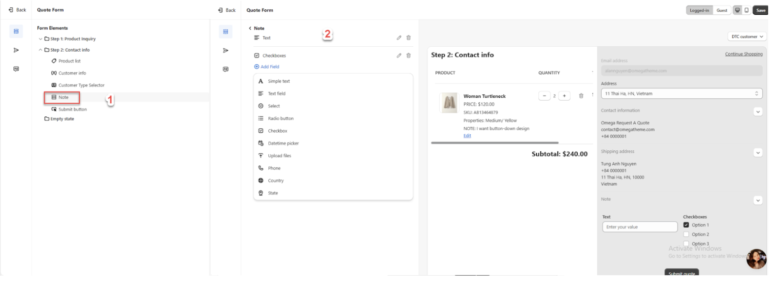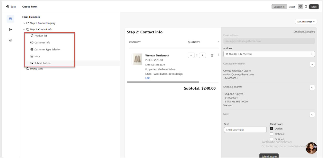 Step 2 - Contact Information: This form gathers customer information. For B2B customers, it includes fields such as email, contact information, location, shipping address, billing address, and a special note for quotes. For DTC customers, it includes email, contact information, shipping address, and a customer note for quotes.