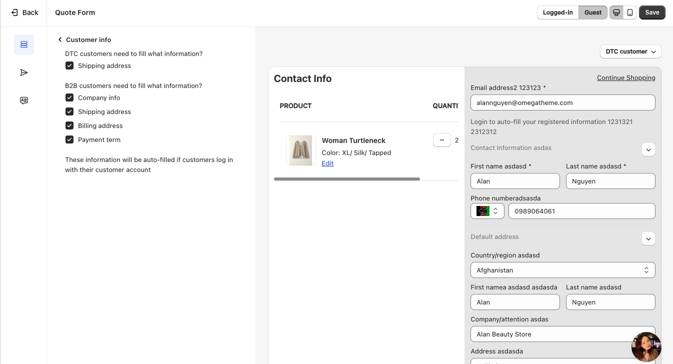 Customer Type Selector – Choose how to categorize customers, such as B2B or DTC, to tailor the form experience.