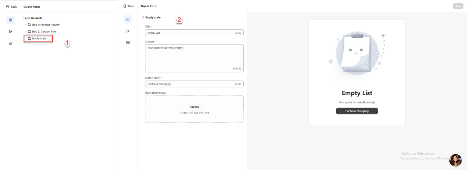 Empty State: You can customize the label, notification text, and business logo that will be displayed when there are no quotes. This allows you to create a personalized confirmation message and branding for users.