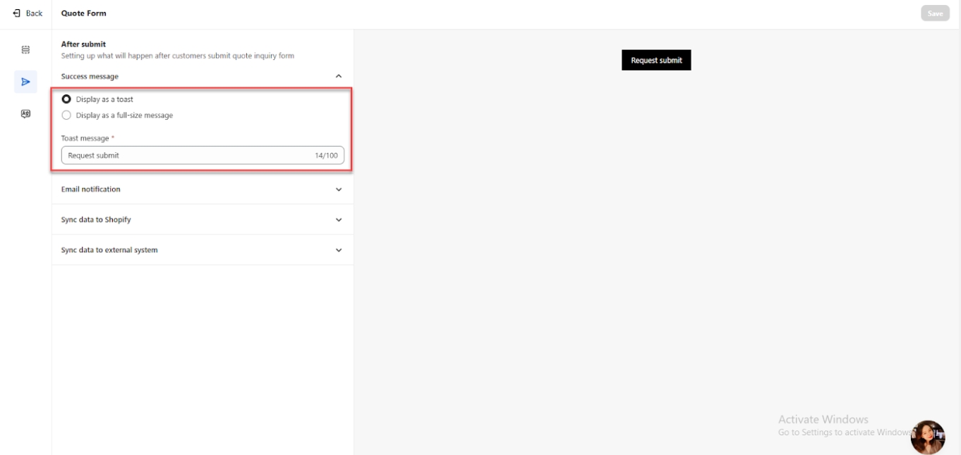 Display as a Toast – Shows a brief pop-up notification upon successful quote submission.