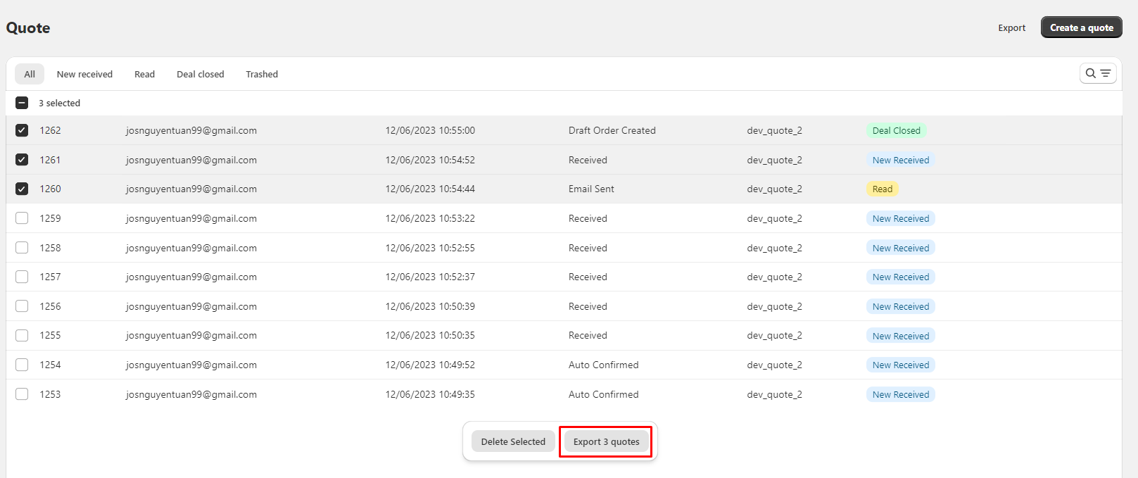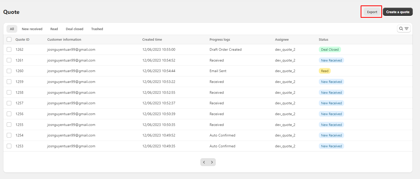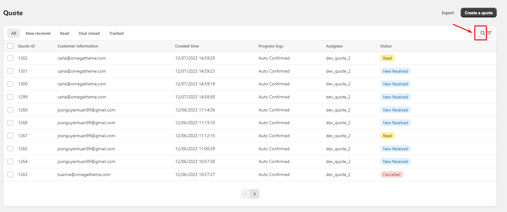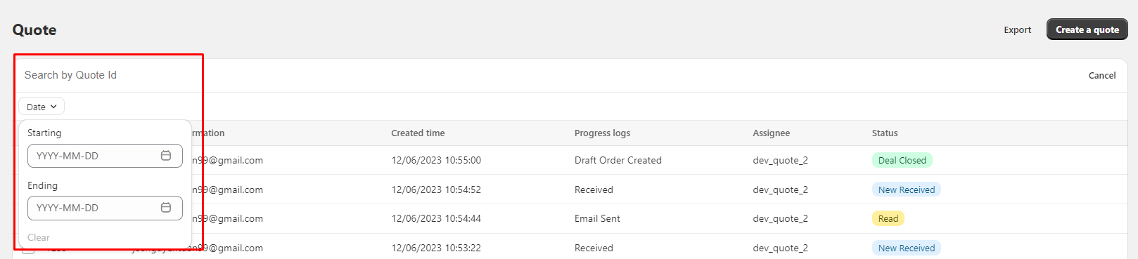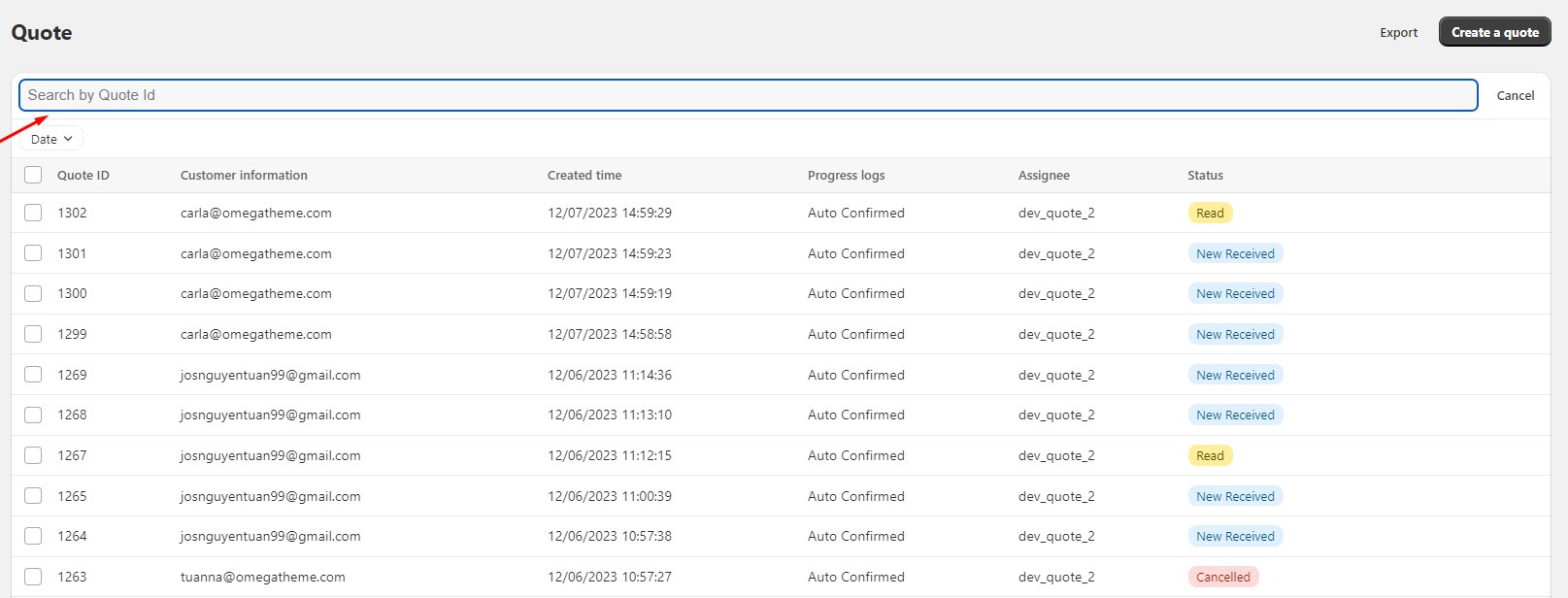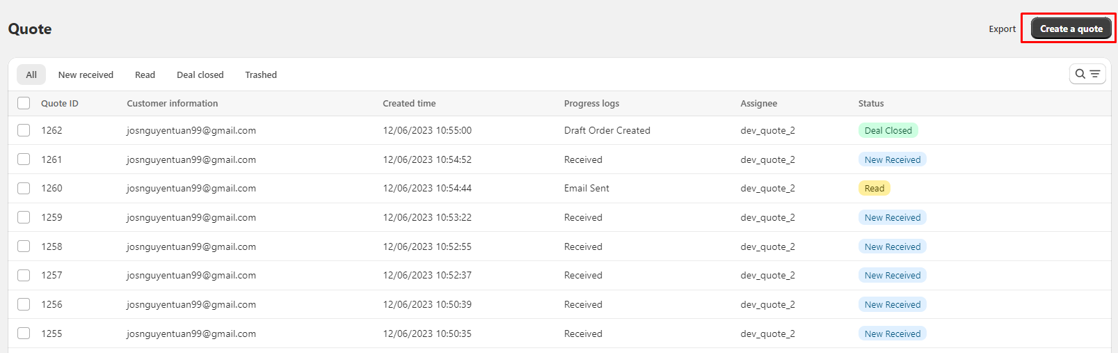 In the **Quote List,** you can see a list of quote requests with basic information: **name, status and created date.**&#x20;