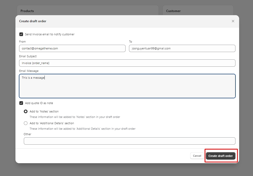 When you click Create draft order, you can also send an email with final offer price/invoice will be sent to customer by click "Send Invoice email to notify customer"