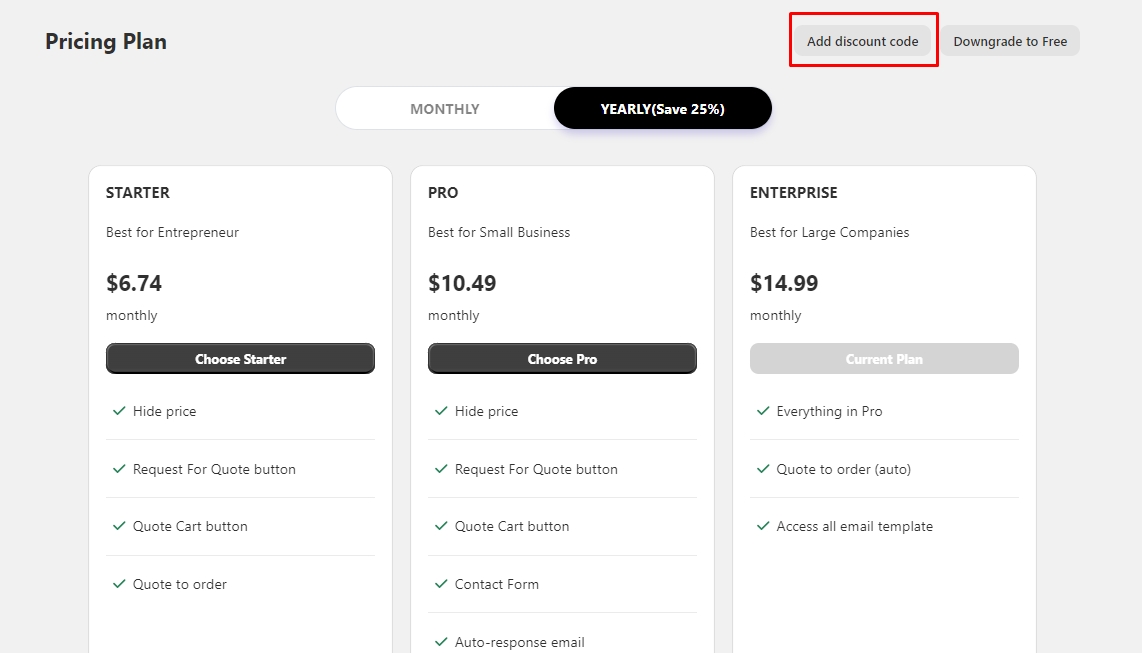 Select Yearly tab, click Add promo code to apply discount code for yearly plans
