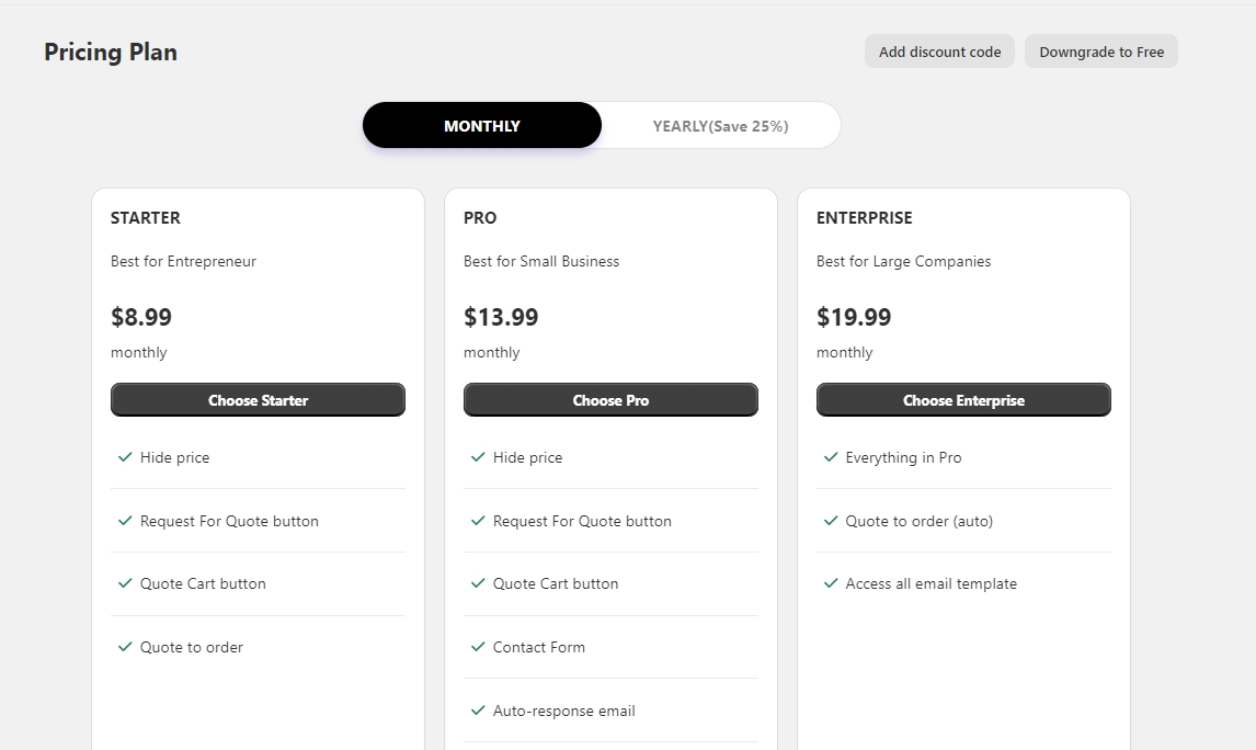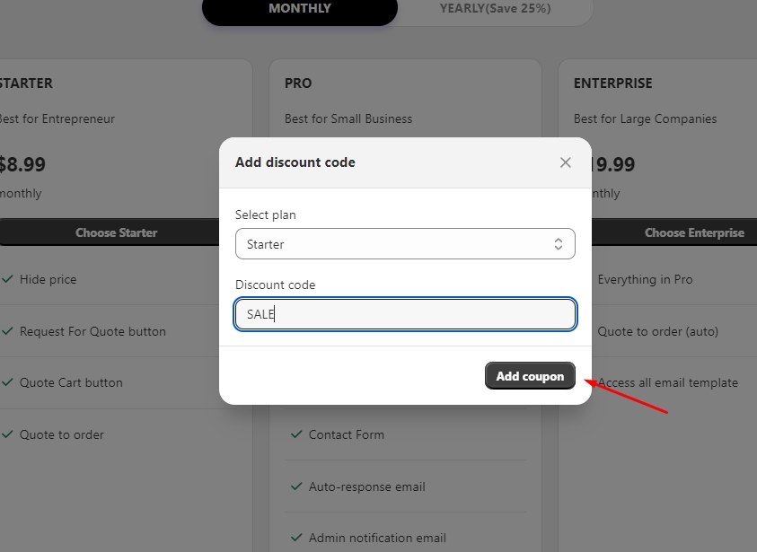 Select Monthly tab, click Add promo code to apply discount code for monthly plans